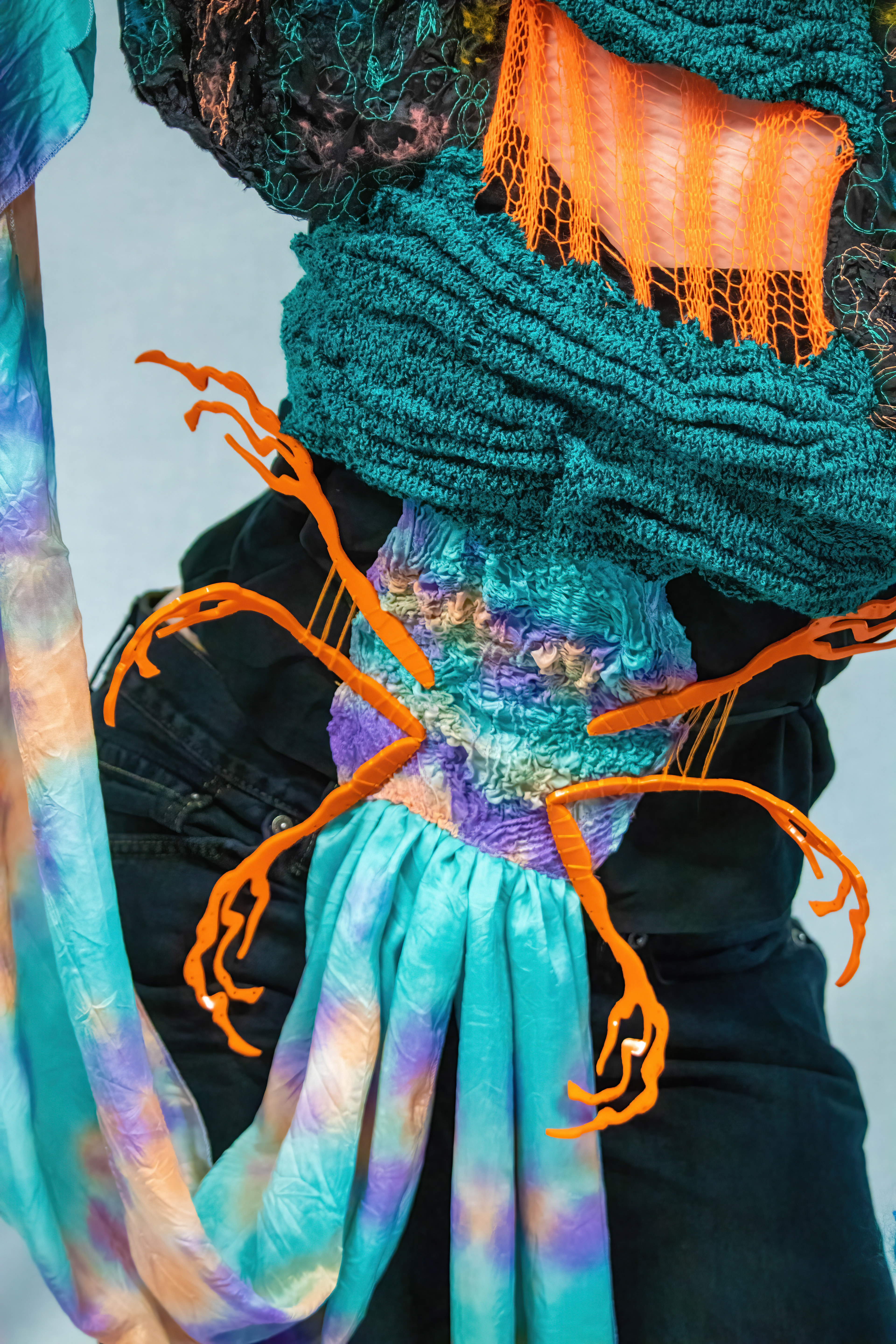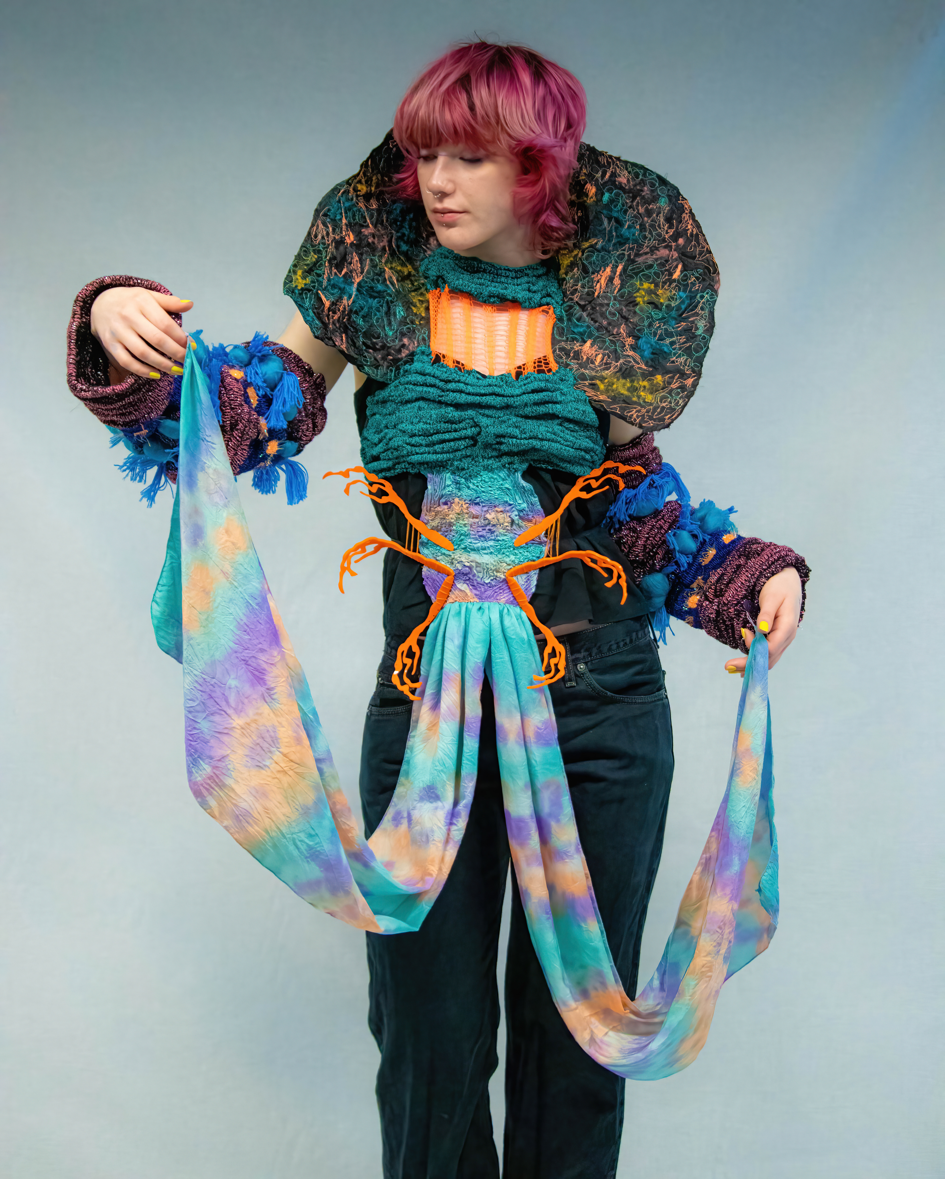 Inspired by the otherworldly, Buggin Out explores the microscopic world of insects and the stages of metamorphosis. This theme of transformation is explored through mixed-media, performative costume, creating hybrid forms that combine humanoid characteristics with insect features. Imagery extracted from caterpillars look at the pleated, elongated forms through machine knitting methods. Bold, geometric patterns are tie dyed to silk, influenced by the intricate details of Picasso beetles, paired with the floaty movements of butterfly wings.