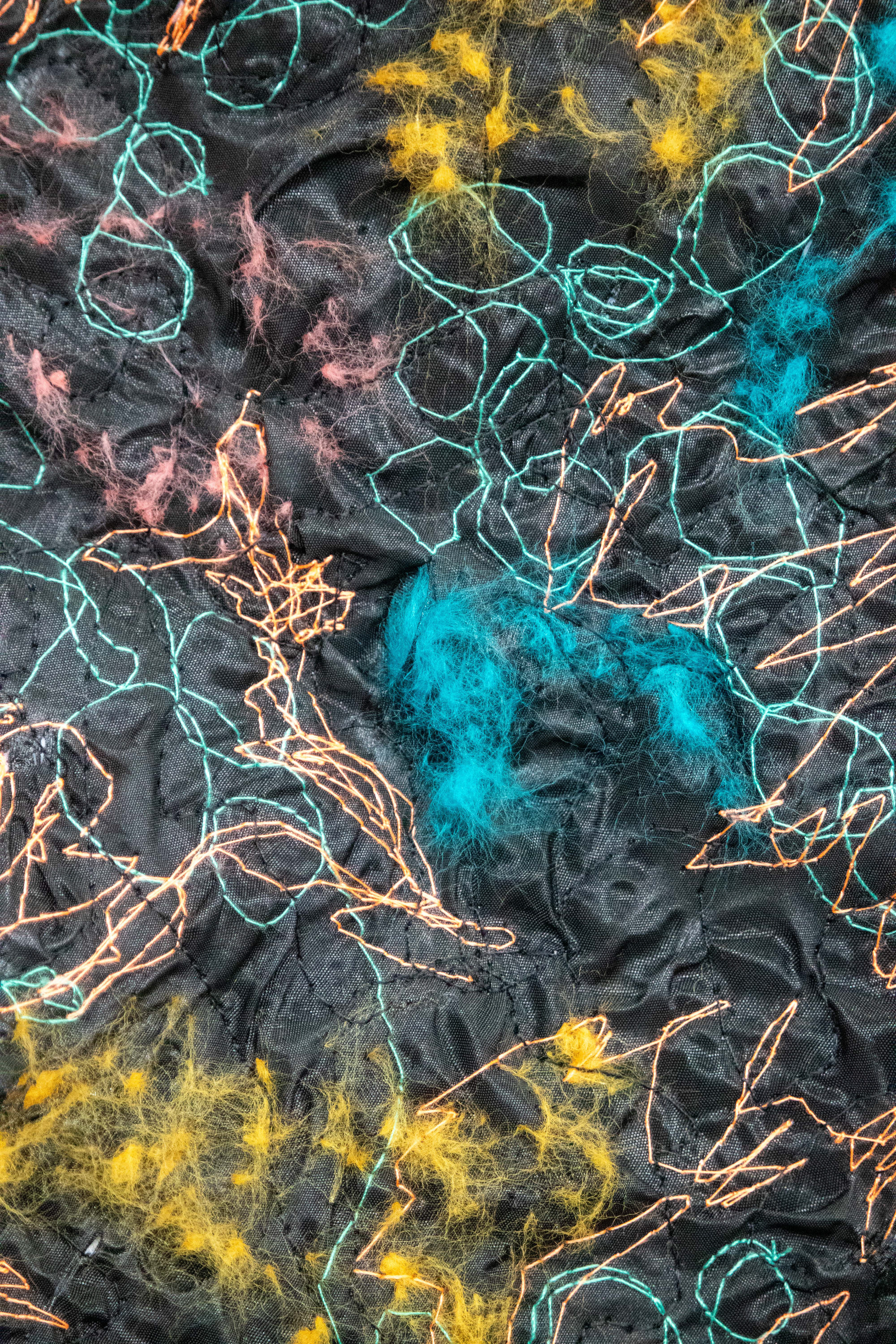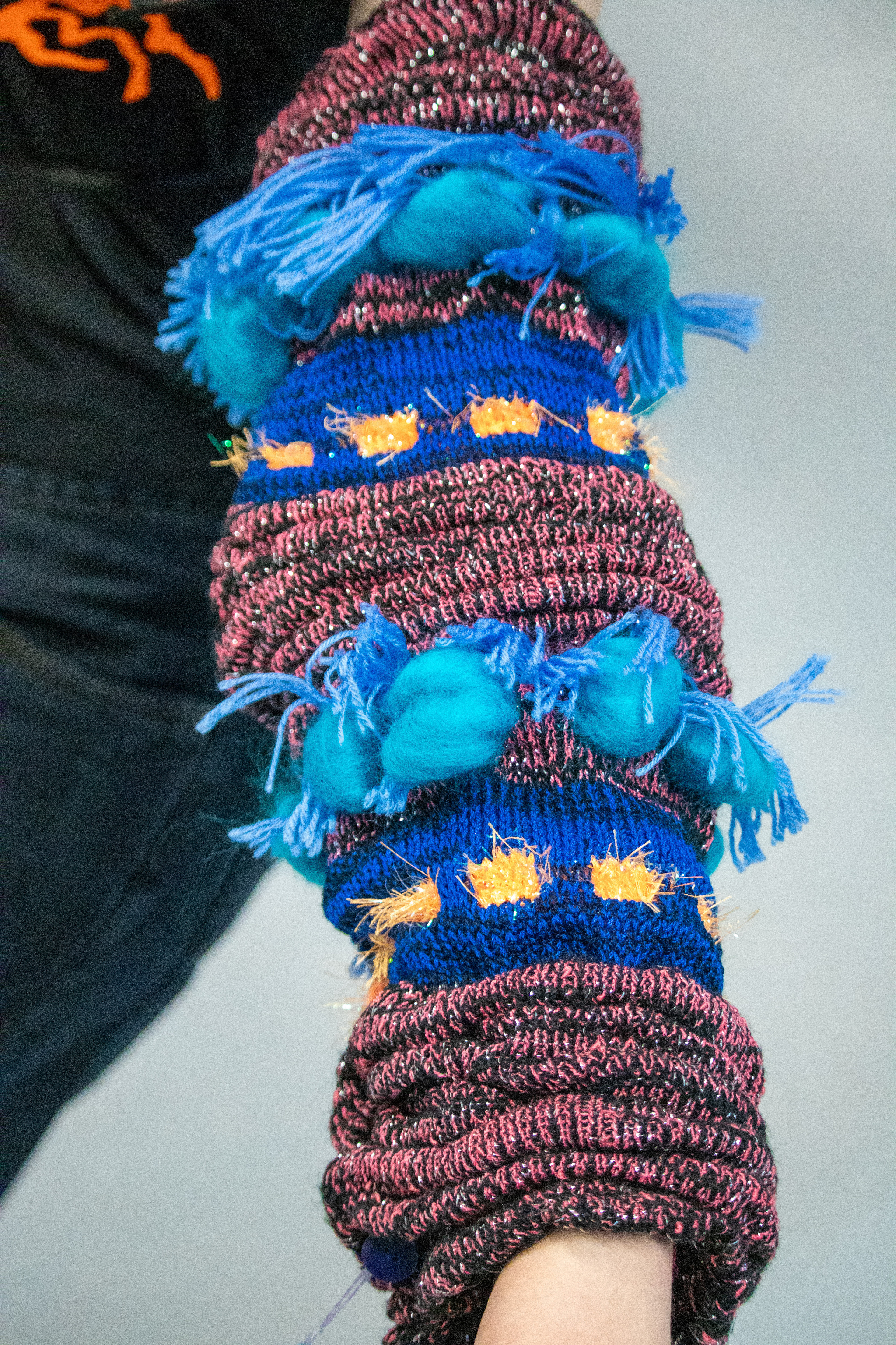 Above left & right : Machine knit caterpillar sleeves, and close up detail of free-motion embroidered collar.