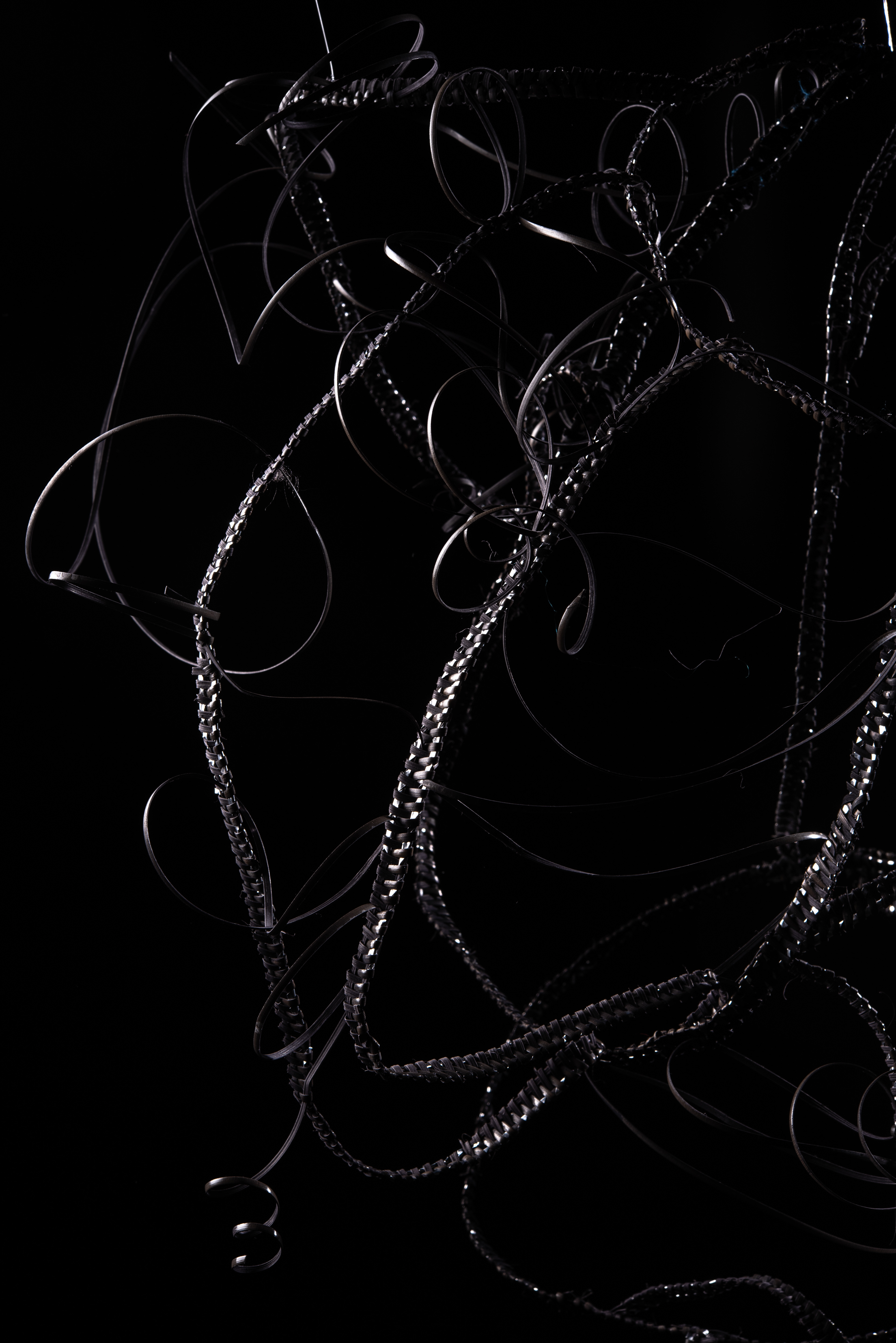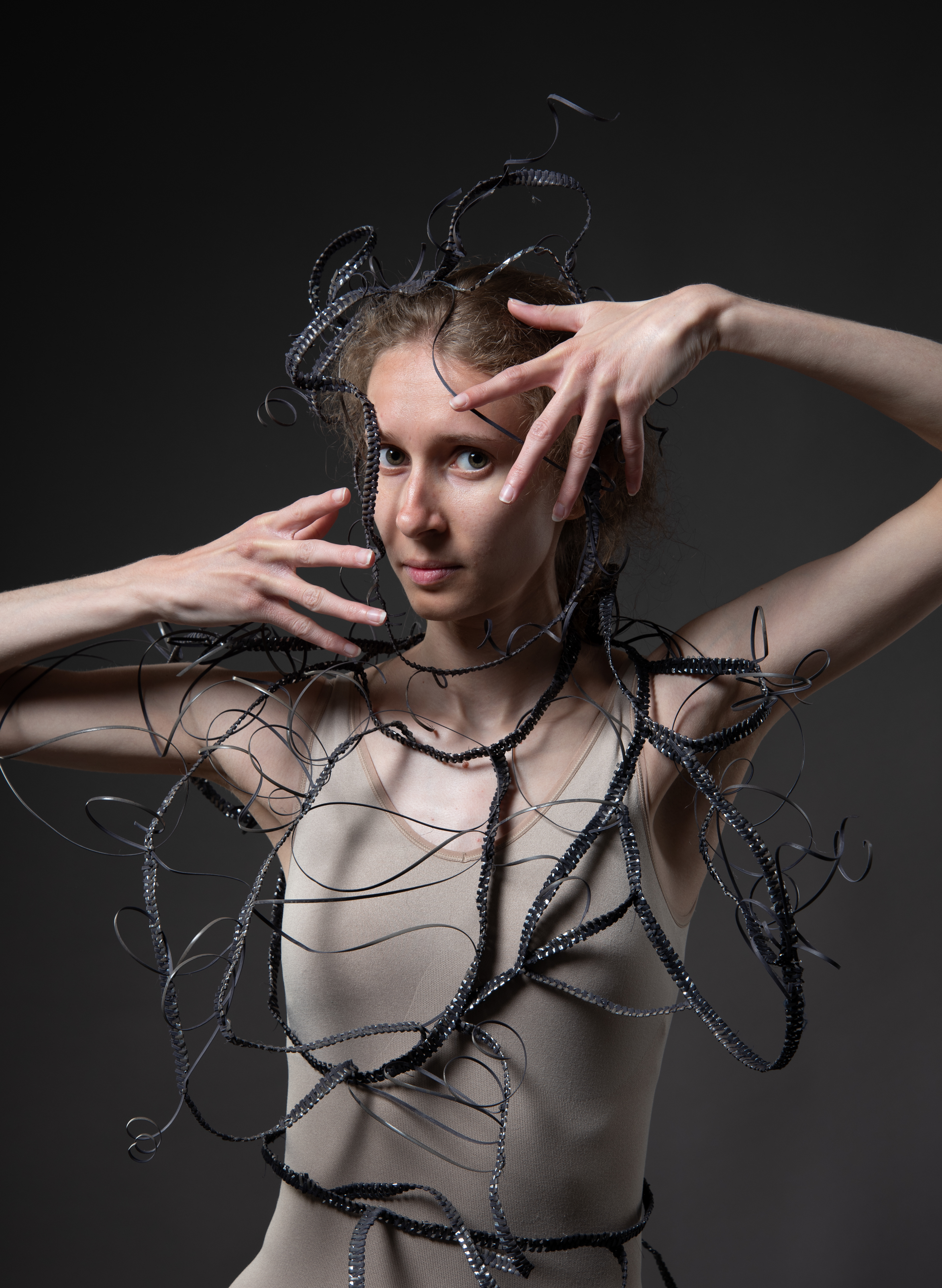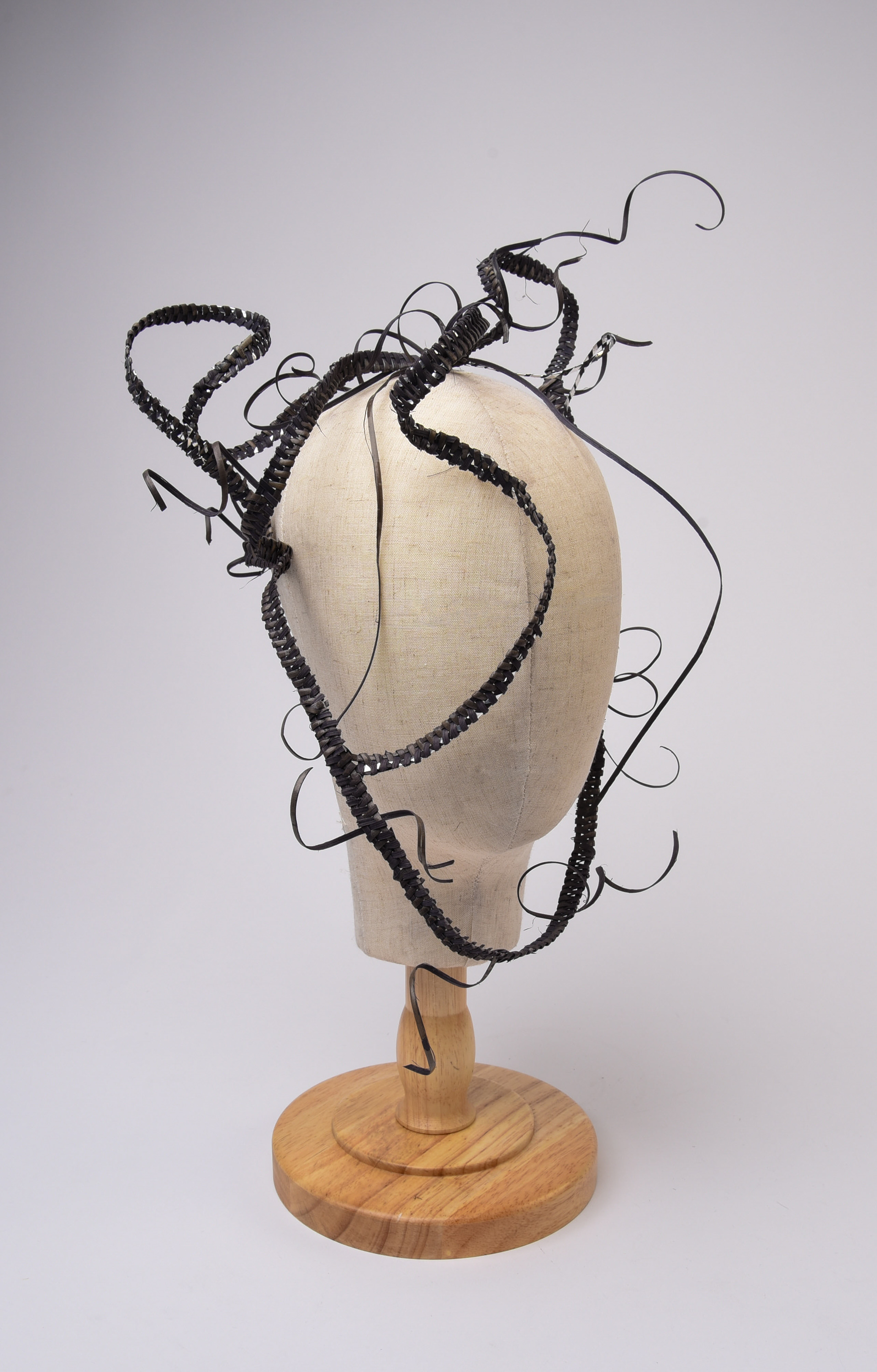 (Just My Luck, 2025). Headpiece (270mm x 1,200mm) and bodice (470mm x 580mm) woven with oak gall and iron dyed chair canning with strips of aluminium.