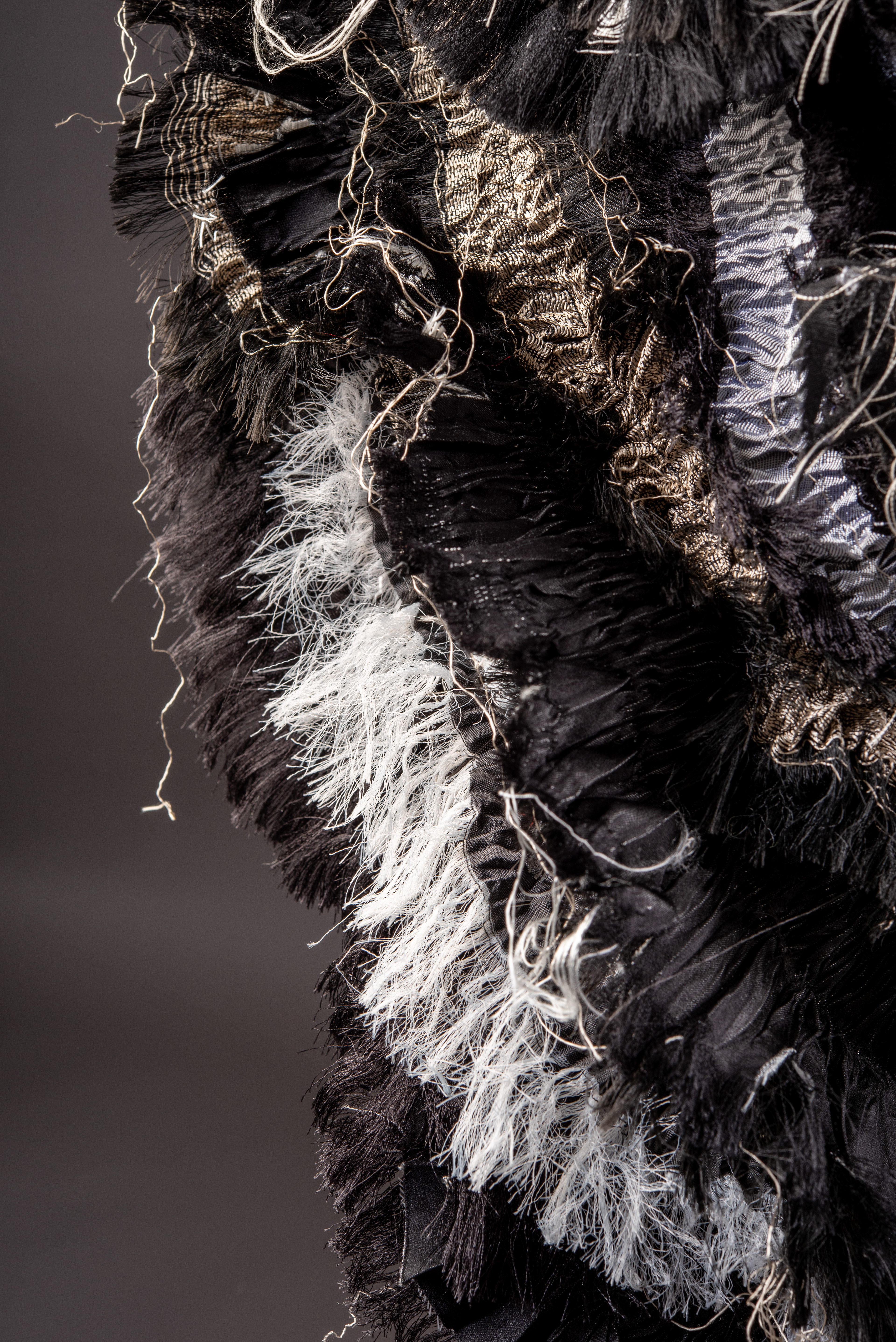 Moulting Grief (Just My Luck, 2025). Pelt (450mm x 1,150mm) made from pleated and slashed deadstock silk, inspired by bird skins found at the Natural History museum. Model: Hannah King.