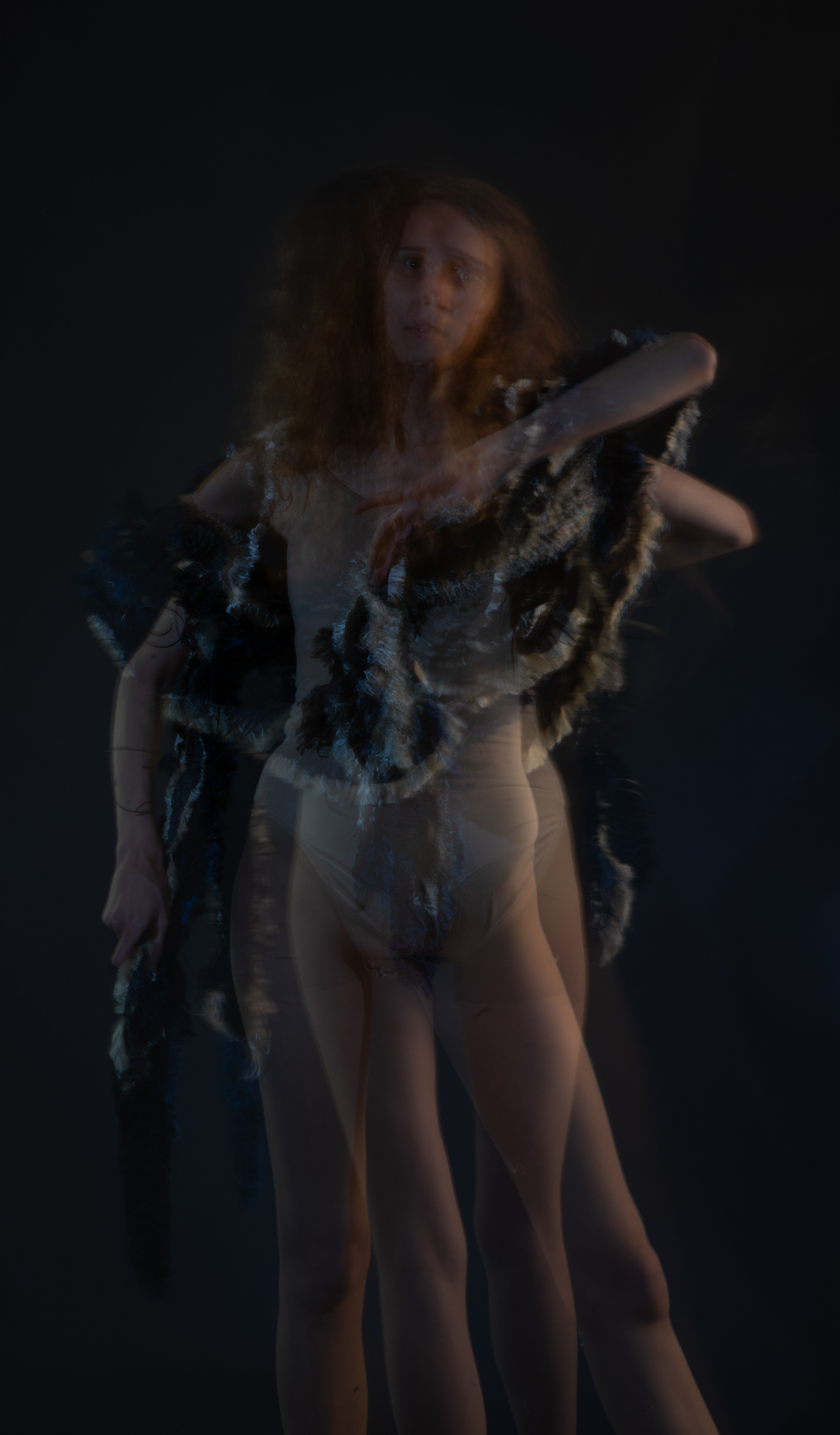 (Just My luck, 2025). Boa (290mm x 2,710mm) constructed from two-tone. deadstock silk and oak gall and iron dyed canning embellishment.